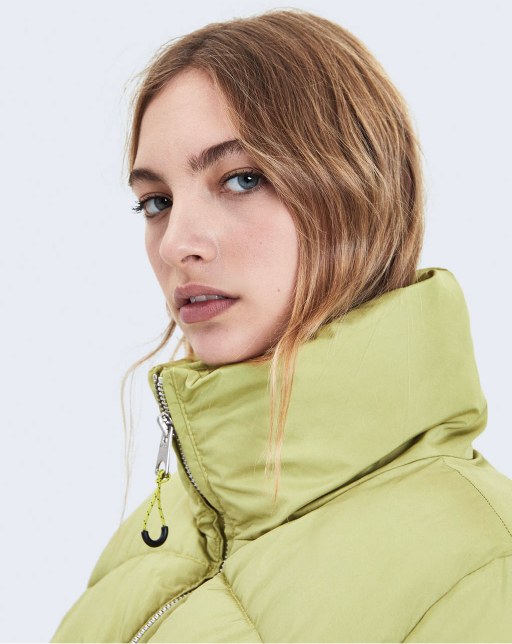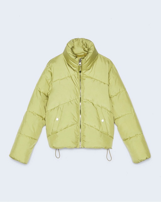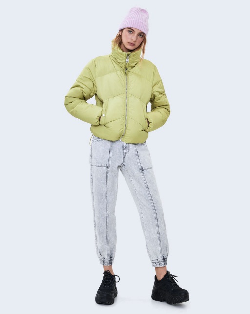 The insulated jacket is made of leather. A light layer of insulation. Details: stand-up collar, zipper, two pockets on the sides.