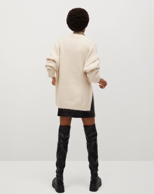 The insulated jacket is made of leather. A light layer of insulation. Details: stand-up collar, zipper, two pockets on the sides.